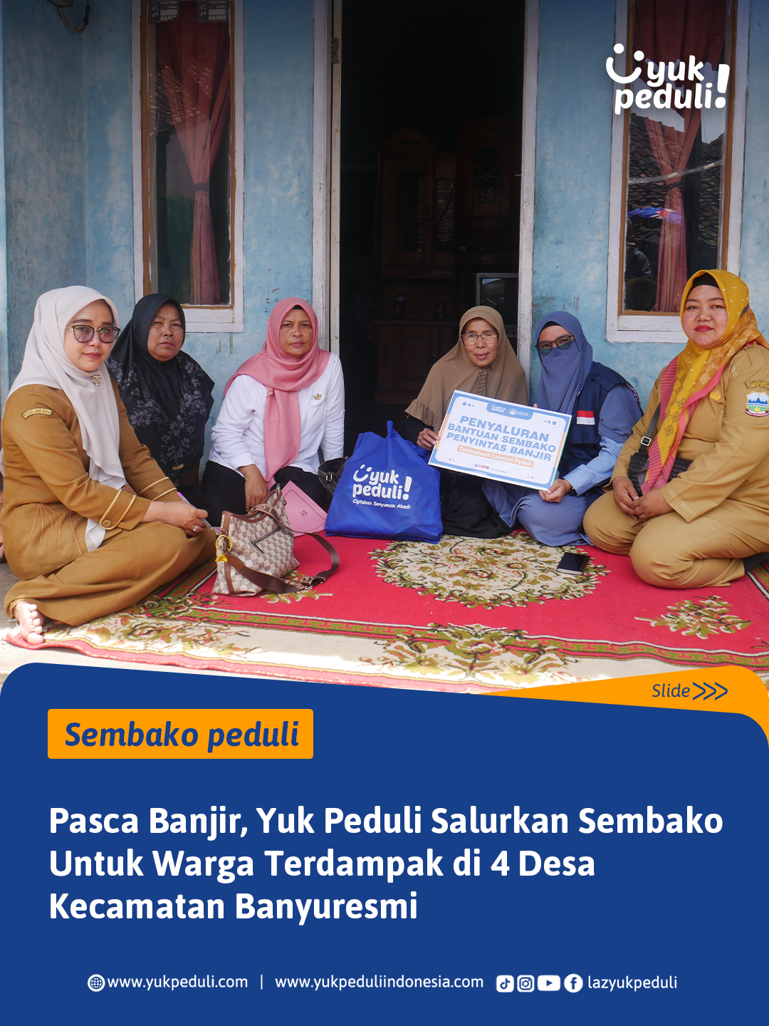 Selain kebutuhan pangan, Yuk Peduli juga menyalurkan bantuan non-pangan berupa selimut, kasur lipat, popok bayi, perlengkapan mandi, serta kebutuhan dasar lainnya. Proses penyaluran dilakukan langsung kepada warga terdampak, dan bantuan disesuaikan dengan kondisi lapangan.