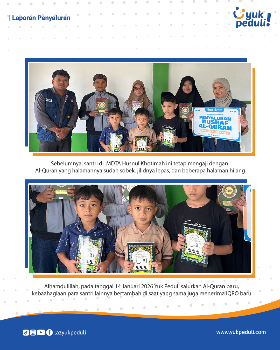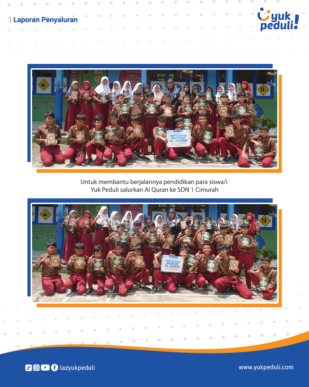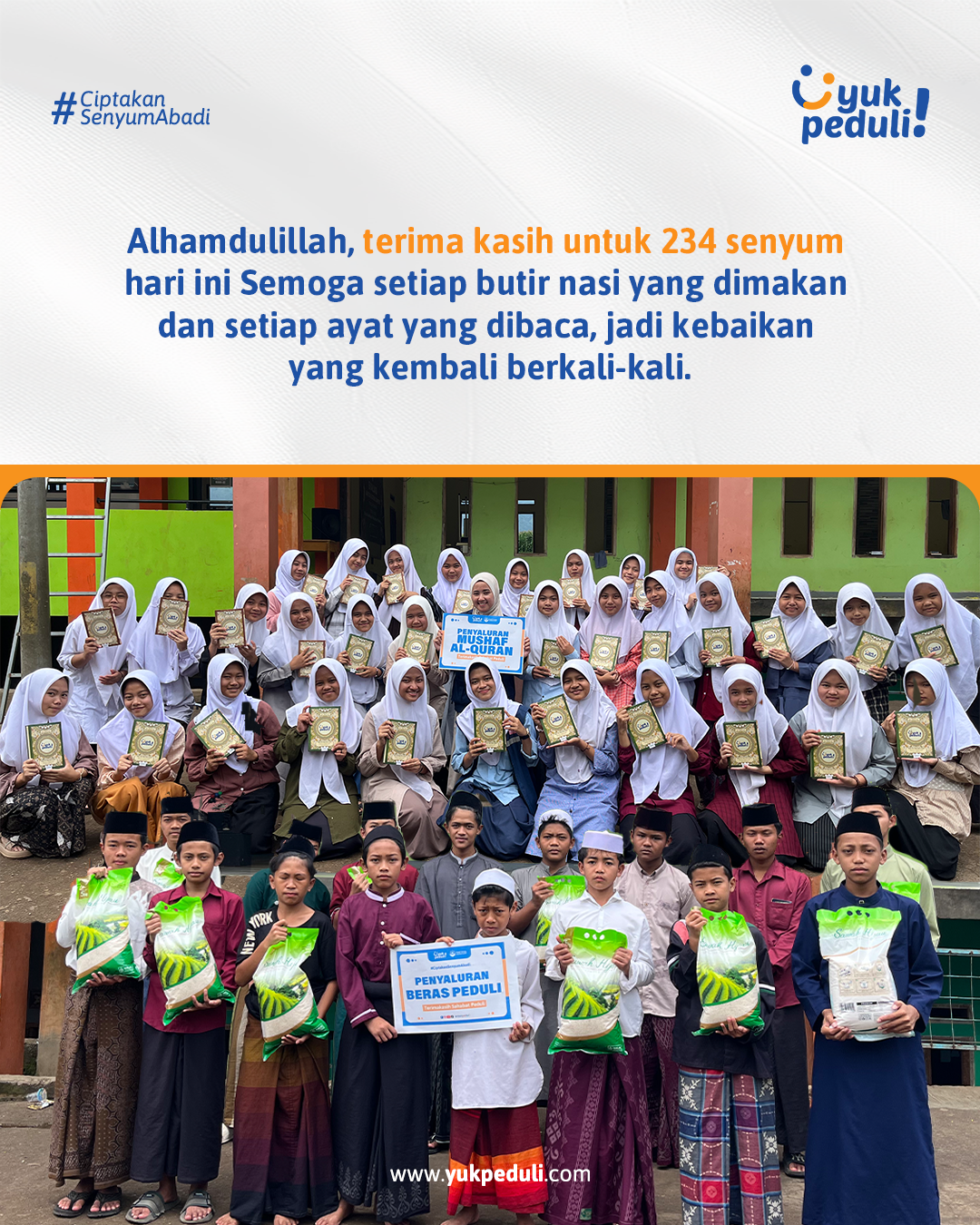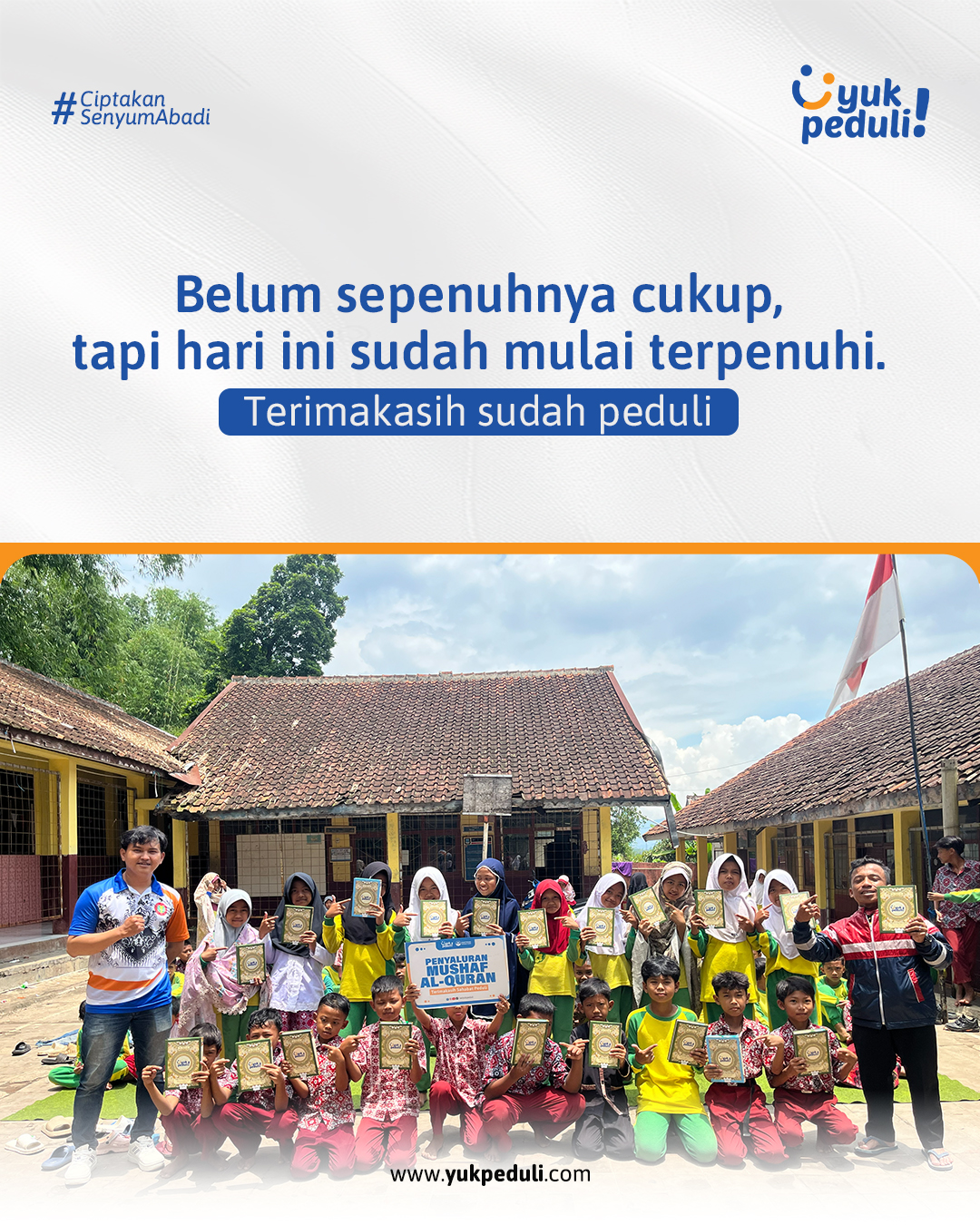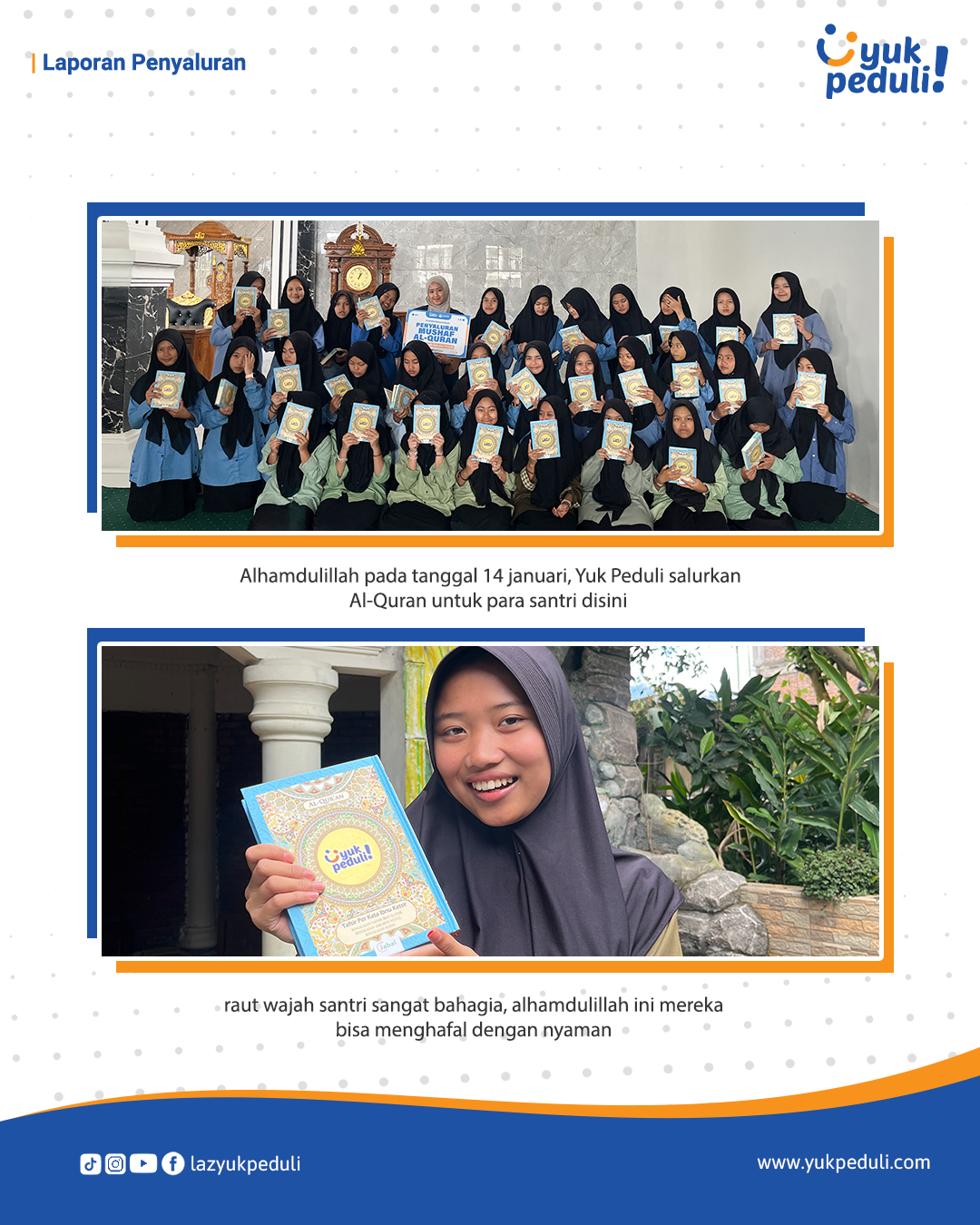 Dapatkan update dan laporan program melalui email/whatsapp yang Sahabat cantumkan. Terima kasih kami ucapkan, doa dan dukungan Sahabat Yuk Peduli sangatlah berarti.