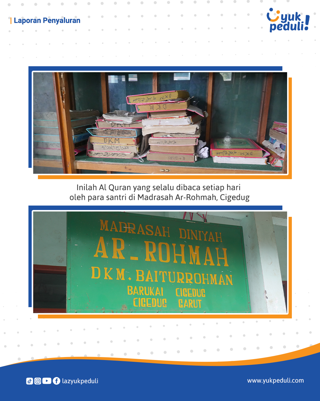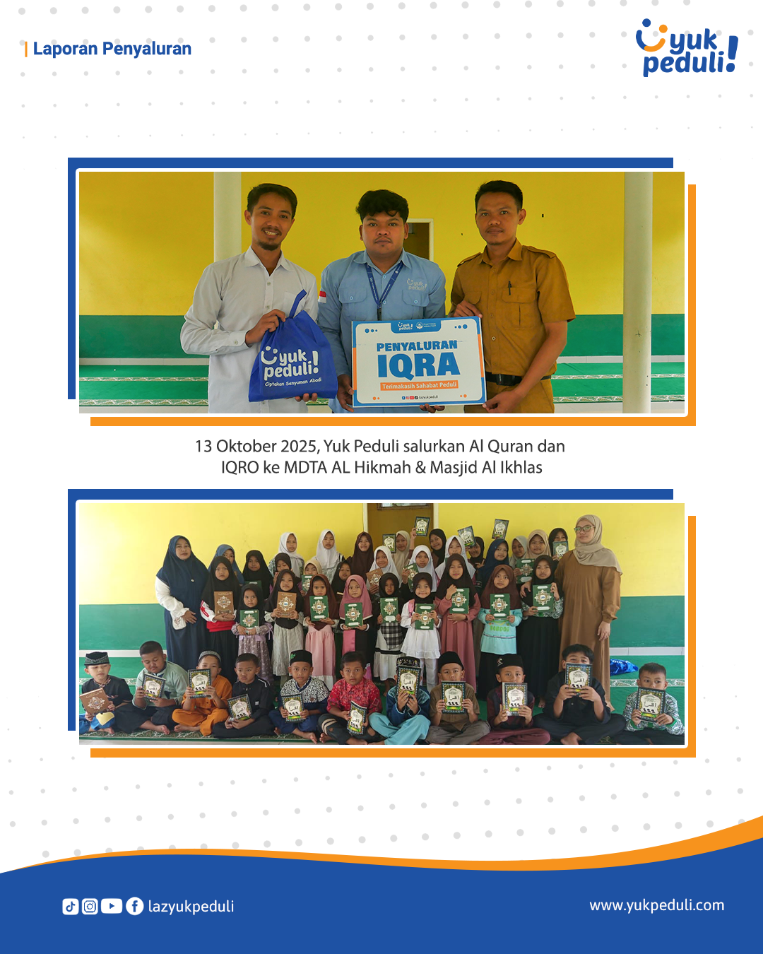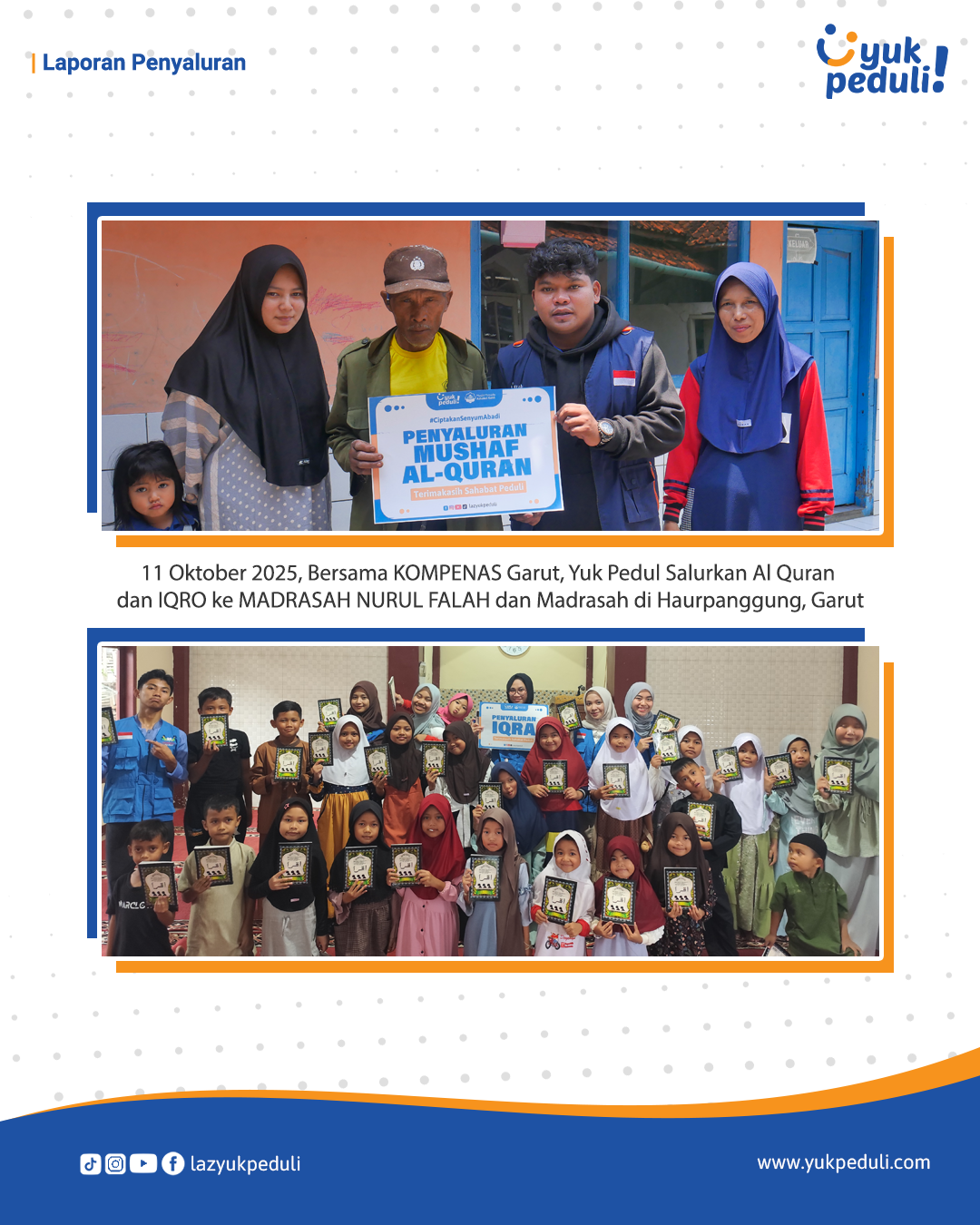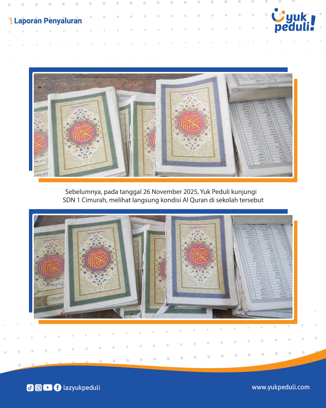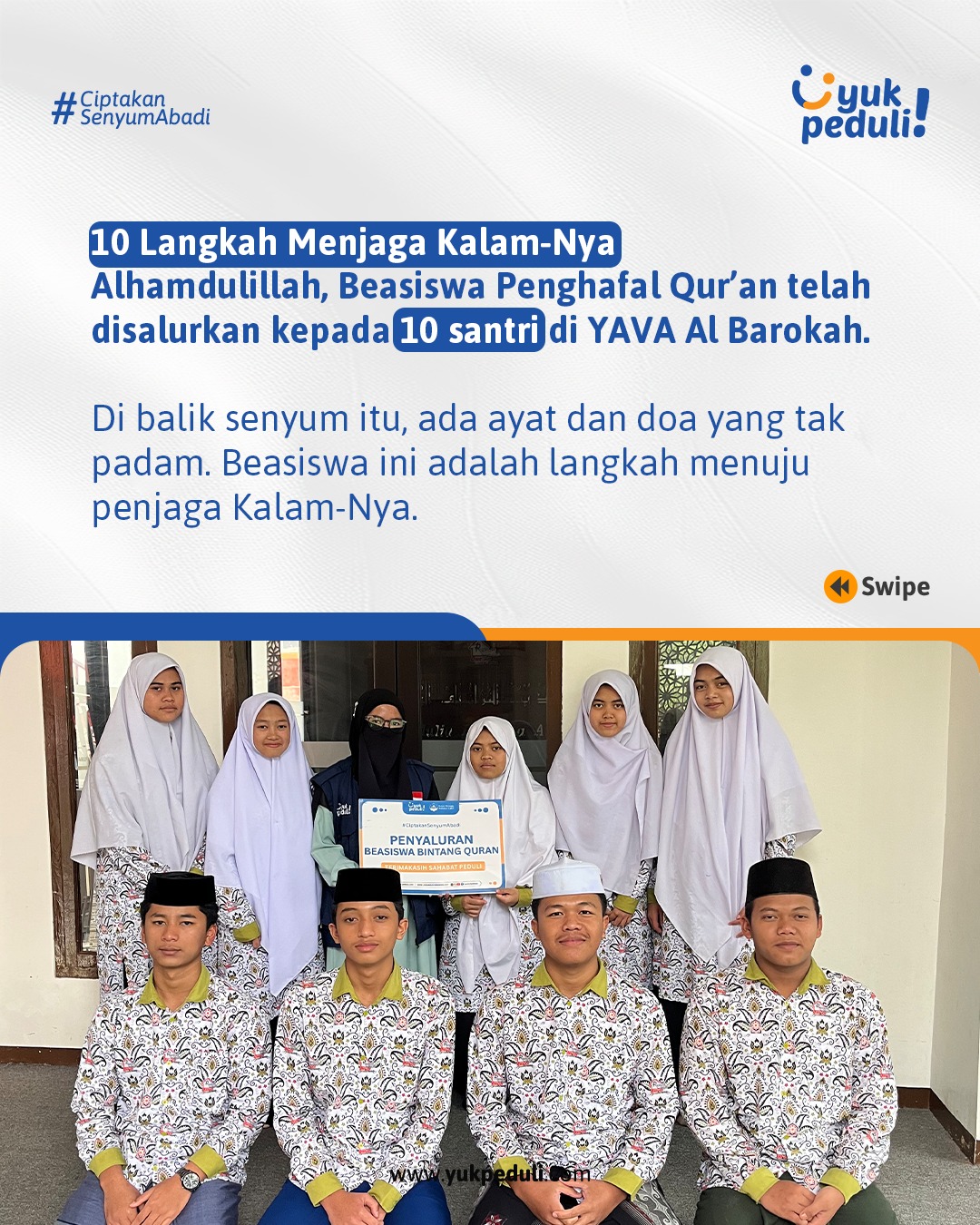 Dapatkan update dan laporan program melalui email/whatsapp yang Sahabat cantumkan. Terima kasih kami ucapkan, doa dan dukungan Sahabat Yuk Peduli sangatlah berarti.