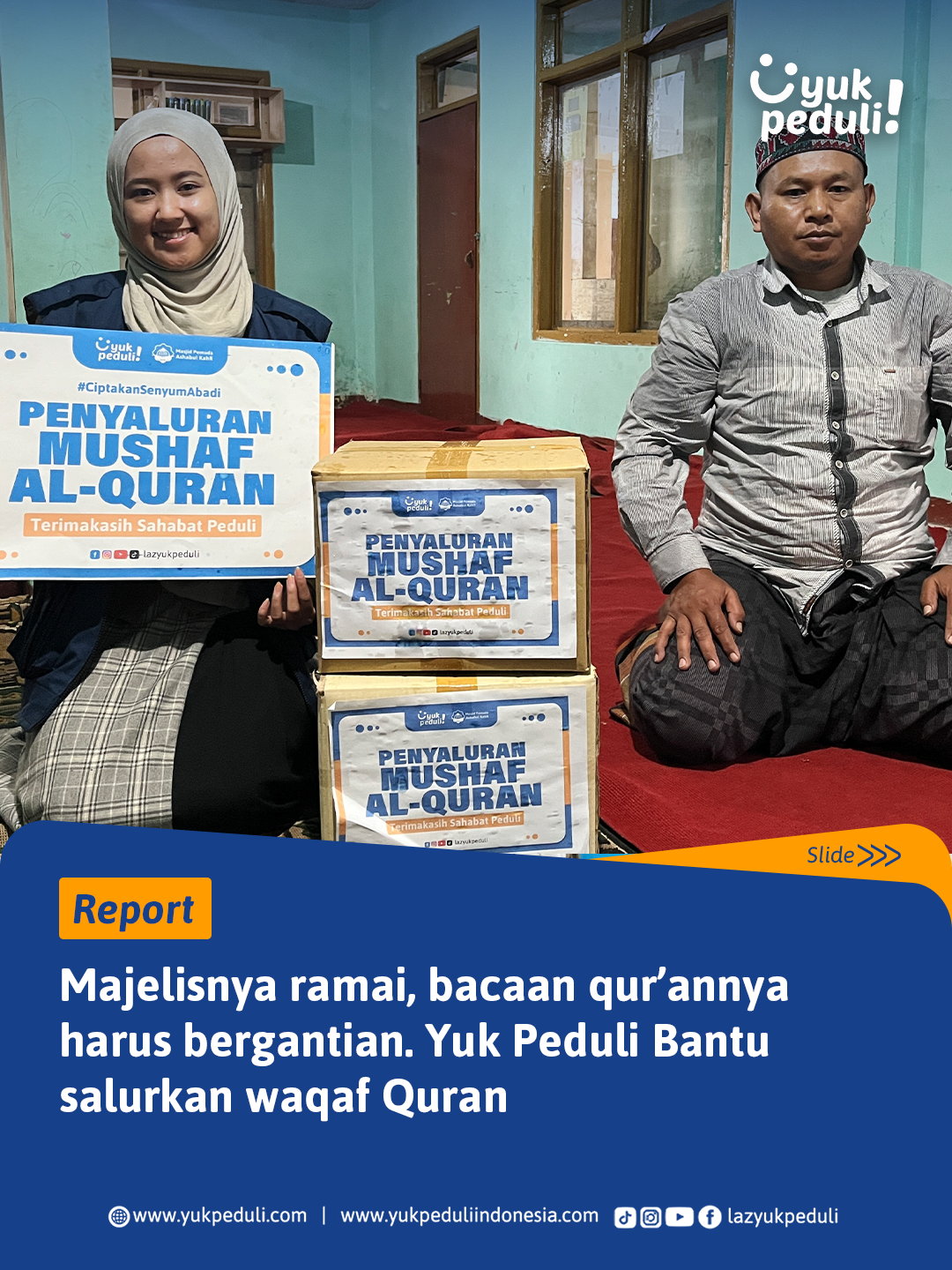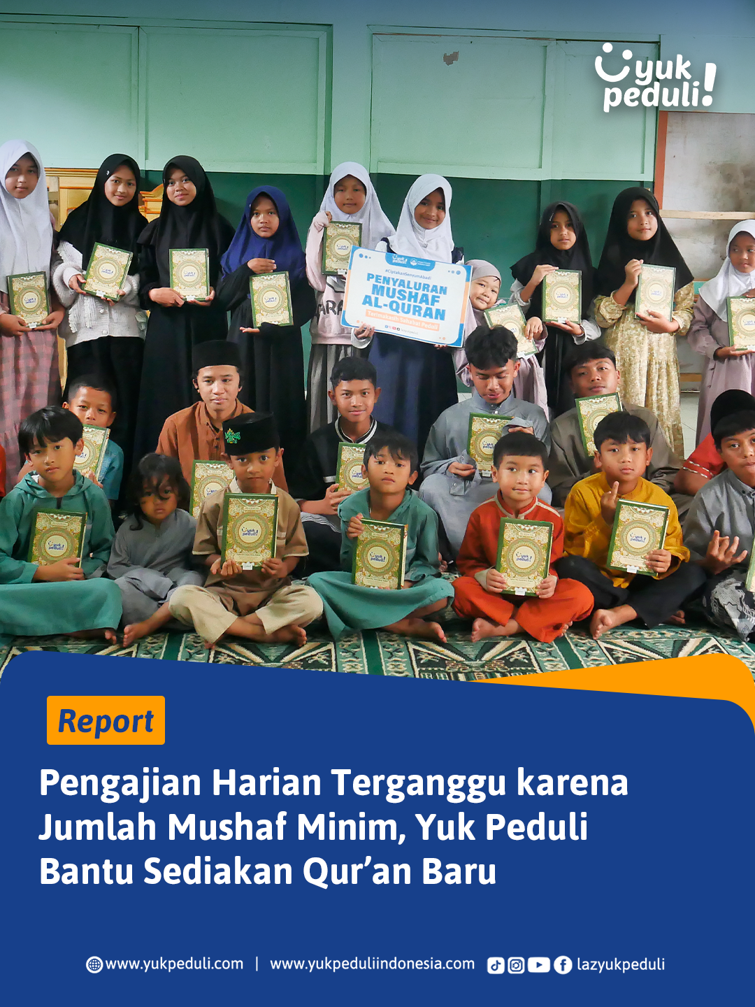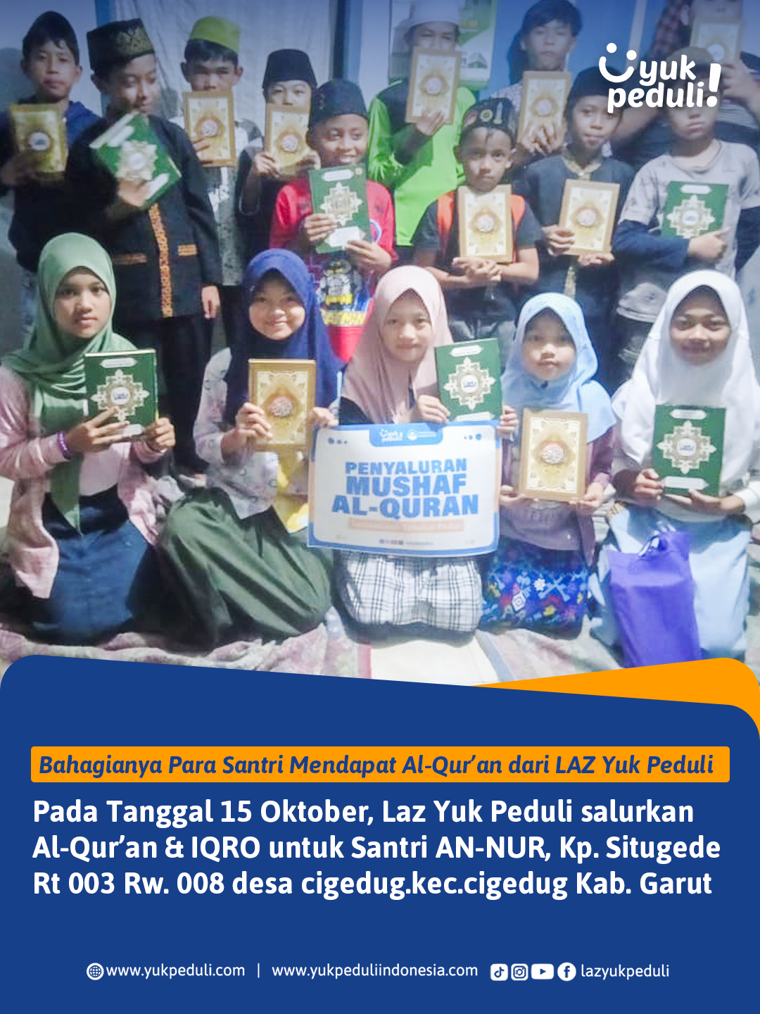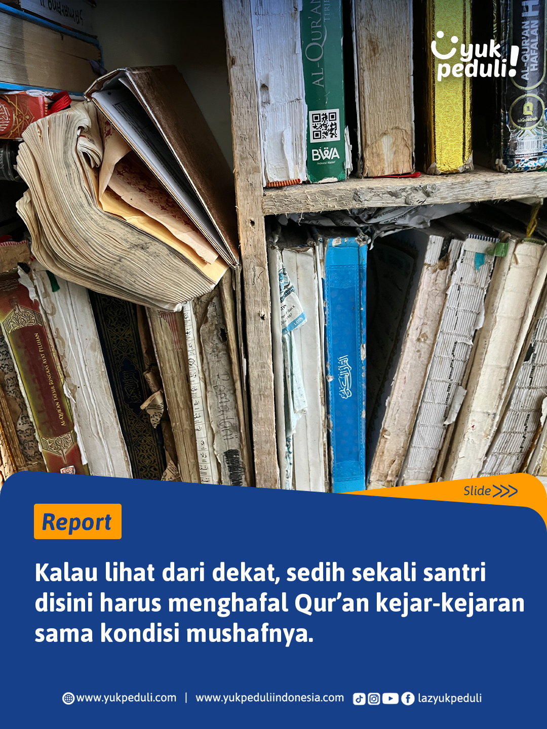 Oleh sebab itu, kami mengajak #SahabatPeduli untuk ikut bersedekah Al-Qur'an bagi para santri penghafal Al-Quran ke pelosok daerah Indonesia.