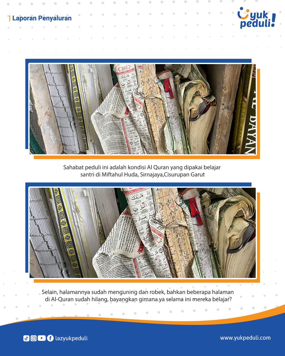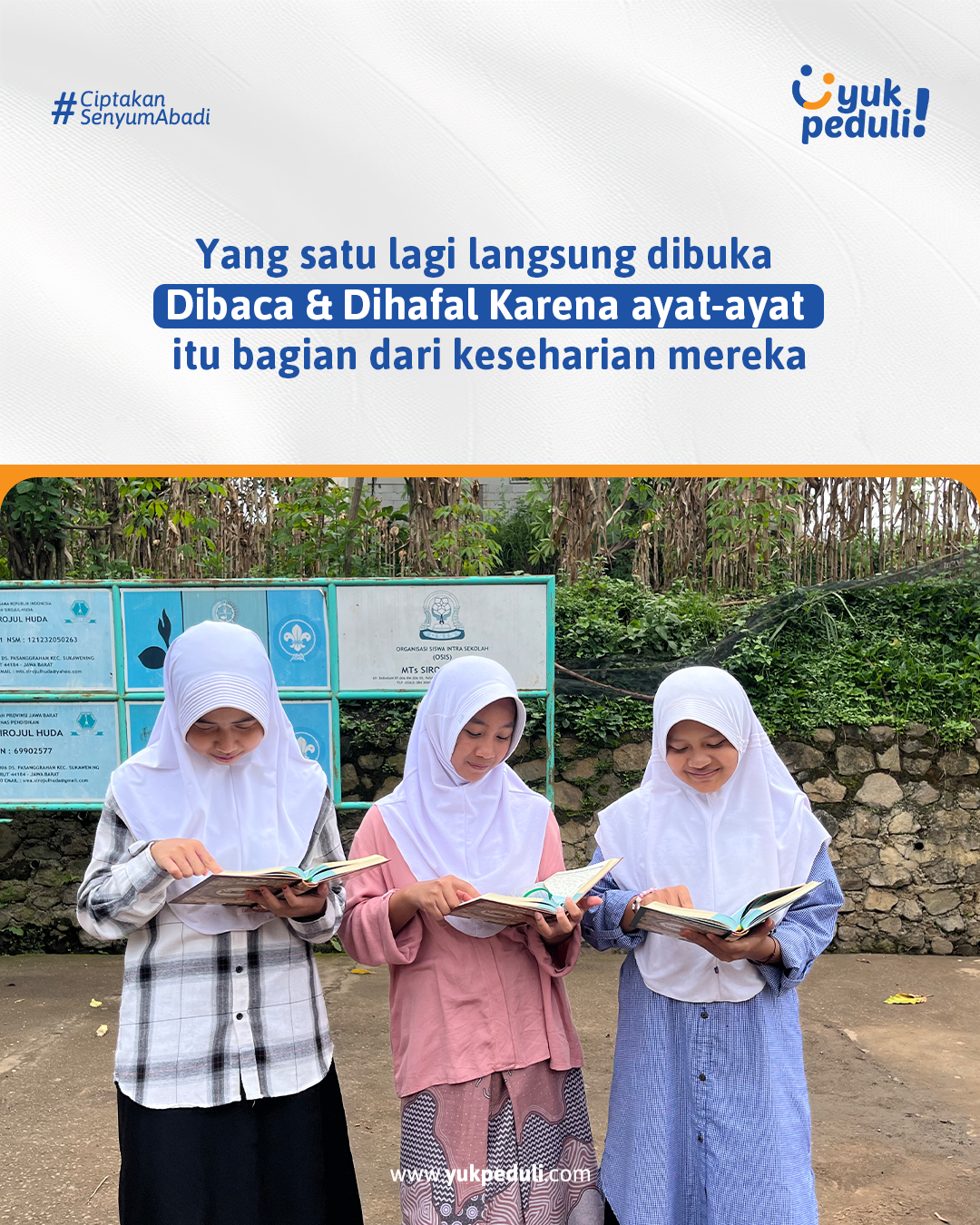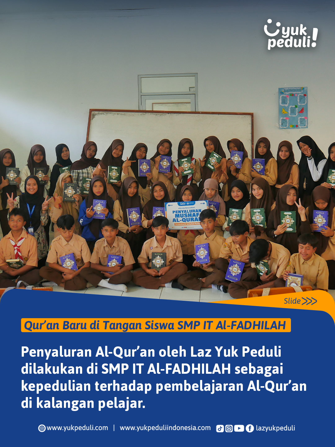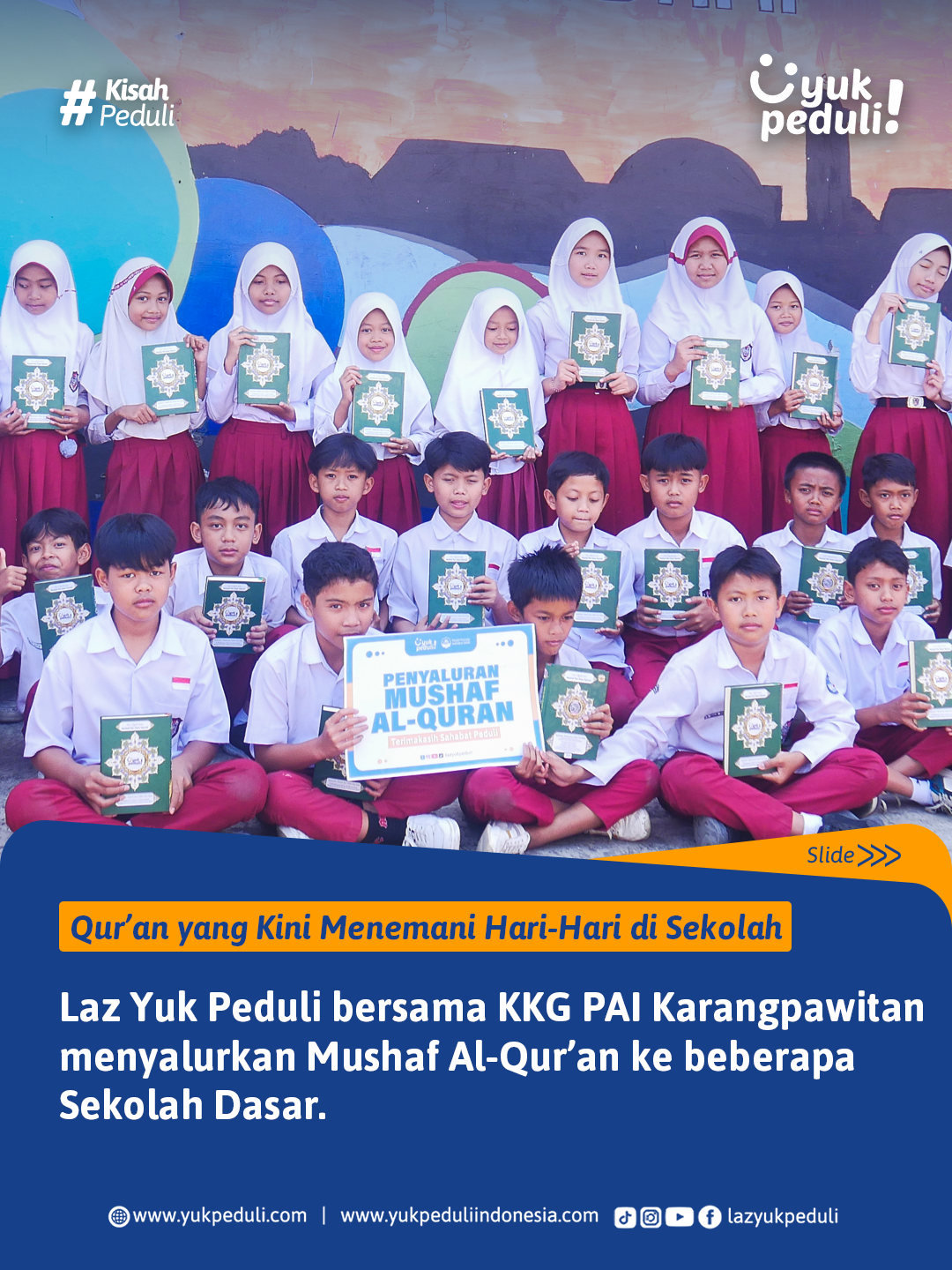 Oleh sebab itu, kami mengajak #SahabatPeduli untuk ikut bersedekah Al-Qur'an bagi para santri penghafal Al-Quran ke pelosok daerah Indonesia.